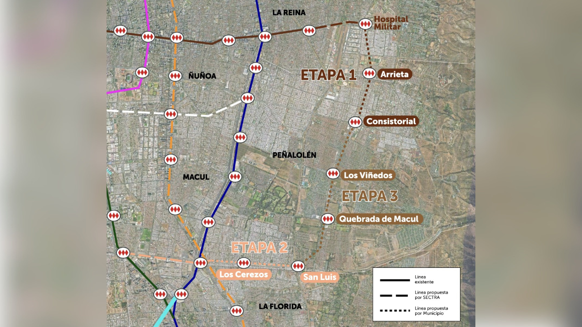 En una segunda etapa, se proyecta la construcción de una nueva línea que transcurra por Av. Departamental, con estaciones como Los Cerezos y San Luis; y, finalmente, la tercera y última fase considera nuevamente la extensión de la Línea 3 hacia el sur por Consistorial, sumando estaciones como Los Viñedos y Quebrada de Macul, además de una futura combinación que conecte con la segunda etapa propuesta. Actualmente, ambas comunas solo cuentan con presencia de Metro en sus límites poniente, a excepción por la estación Castillo Velasco en La Reina.
