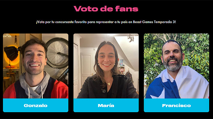 El representante de Chile en los "Beast Games 3" será elegido a través de la votación del público, en la página oficial de Beast Games (https://beastgames. votenow. tv/) o en los perfiles en Instagram de cada uno: @gonzalo_yokota, @joselecaros_ y hanufrancisco.